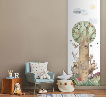 Vliestapete / Metermaß, Kindermotiv eines Baumes und Waldtiere, Grün-, Blau-, Grau-, Braun-, Rot-, Gelbtöne, weißer Hintergrund.