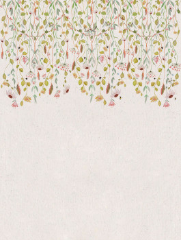 Vliestapete, Motiv aus Blumen, Blättern und Vögeln, Grün-, Ocker- und Rosatöne.