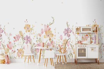Vliestapete, Blumen-, Bienen- und Marienkäfermotiv, Grün-, Rosa-, Gelb- und Lilatöne.