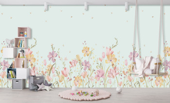 Vliestapete, Blumen-, Bienen- und Marienkäfermotiv, Blau-, Grün-, Rosa-, Gelb- und Lilatöne.
