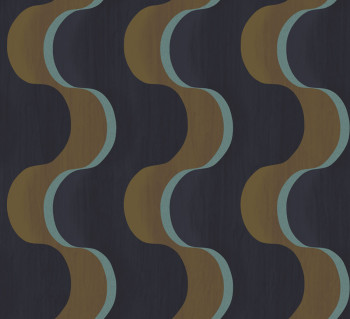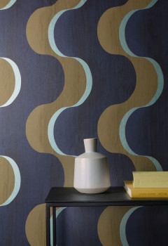 Glatte Vliestapete, 3D-Welleneffekt in den Farbtönen Matt-Dunkelblau, Braun und halbglänzendem Türkis.