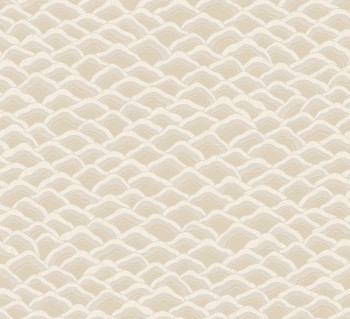 Vliestapete, subtil geprägtes, halbglänzendes Muster, inspiriert von Berglandschaften, in Beige- und Cremetönen.
