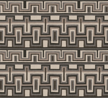 Vliestapete, zart geprägtes grafisches Ethnomuster in Schwarz-, Grau-, Graubeigetönen, teilweise mit silbernen Akzenten.