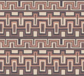 Vliestapete, zart geprägtes grafisches Ethnomuster in Schwarz-, Braun-, Ockertönen, teilweise mit goldenen Akzenten.