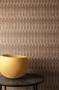 Vliestapete, zart geprägtes Ethnomuster, Brauntöne, stellenweise mit halbglänzenden grauen Akzenten.