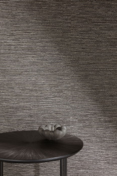 Vliestapete, Imitation eines gröberen Stoffes, Schwarztöne, Brauntöne, metallische braun-goldene Akzente.