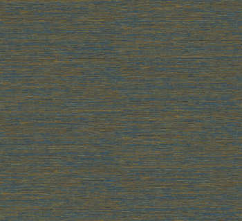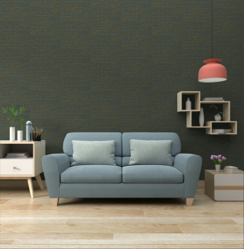 Vliestapete, Imitation eines gröberen Stoffes, Schwarz-, Braun- und Metallic-Türkis-Töne.