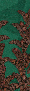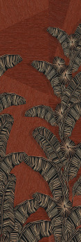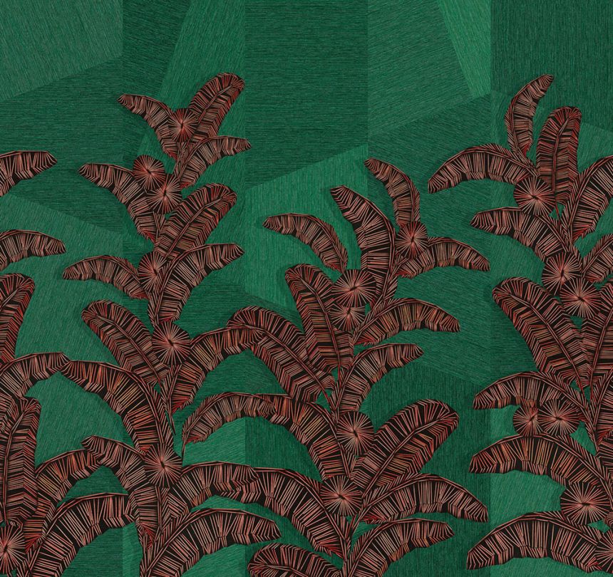 Vlies-Fototapete, Hintergrund erinnert an gröberes Textil und Linien bilden ein Ethno-Blattmuster, Grün-, Braun- und Ziegelrottönen.