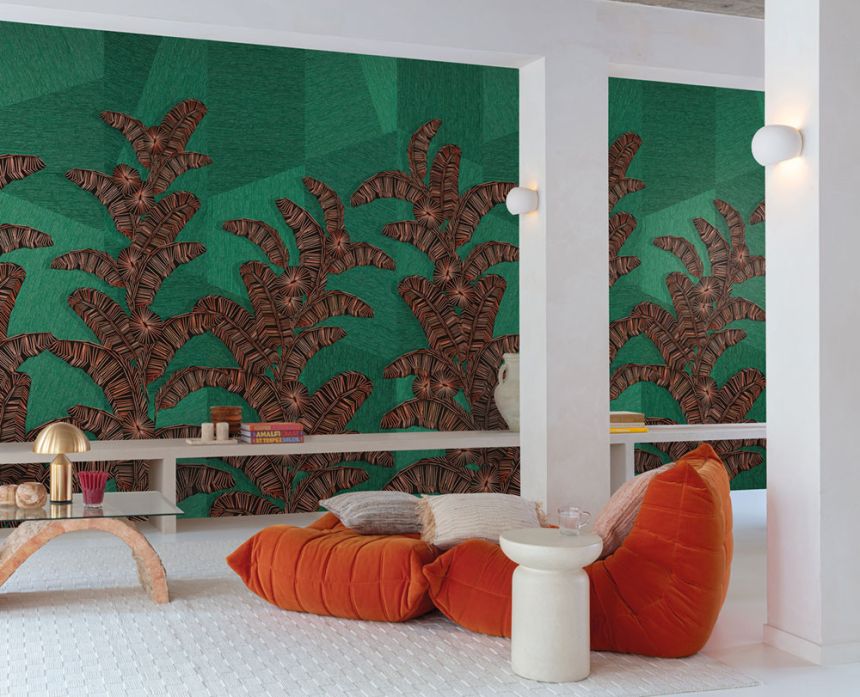 Vlies-Fototapete, Hintergrund erinnert an gröberes Textil und Linien bilden ein Ethno-Blattmuster, Grün-, Braun- und Ziegelrottönen.