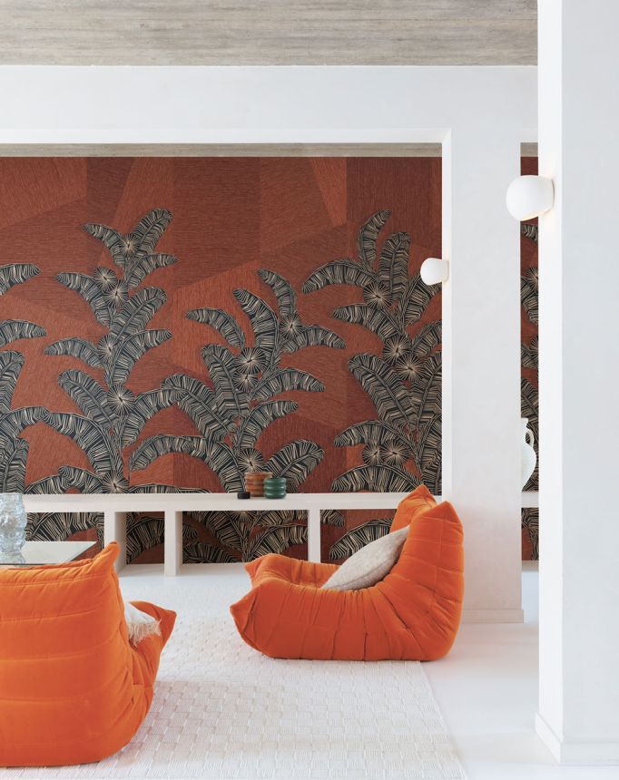 Vlies-Fototapete, Hintergrund erinnert an gröberes Textil und Linien bilden ein Ethno-Blattmuster, Ziegelrot- und Brauntönen.