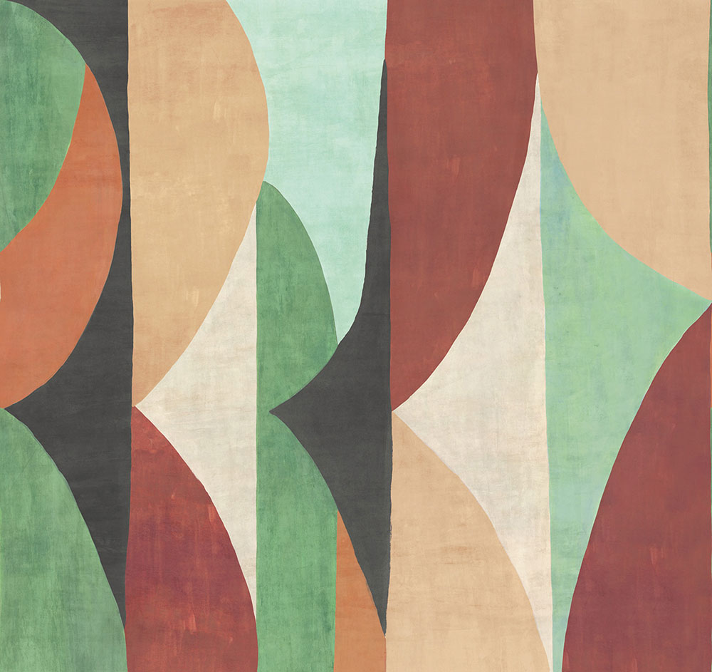 Vlies-Fototapete, dezent geprägt, grafische Muster, Grün-, Braun-, Ziegel- und Beigetöne.