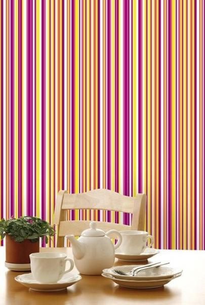 Vliestapete mit Streifenmuster in Gelb-, Rosa- und Lilatönen.