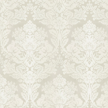 Luxuriöse Vliestapete mit Vinyloberfläche, halbglänzende Cremetöne, barockes Damastmuster.