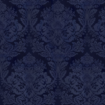 Luxuriöse Vliestapete mit Vinyloberfläche, halbglänzende Blautöne, barockes Damastmuster.