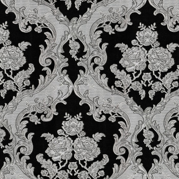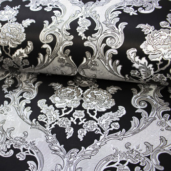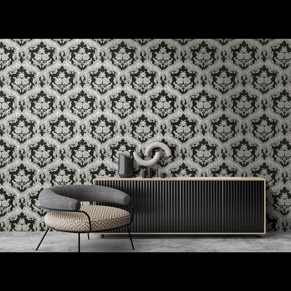 Luxuriöse Vliestapete mit Vinyloberfläche, schwarzer Hintergrund, silbernes Barockmuster.
