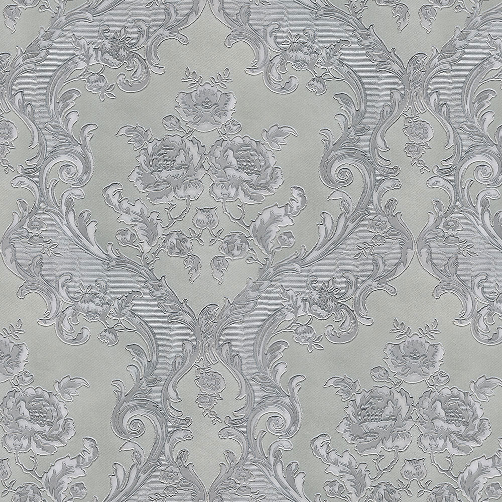Luxuriöse Vliestapete mit Vinyloberfläche, grau-silberner Hintergrund, silbernes Barockmuster.