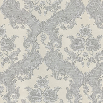 Luxuriöse Vliestapete mit Vinyloberfläche, halbglänzender graubeiger Hintergrund, silbernes Barockmuster.