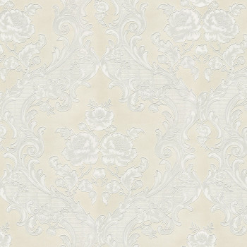 Luxuriöse Vliestapete mit Vinyloberfläche, halbglänzender perlweißer Hintergrund, cremefarbenes Barockmuster.