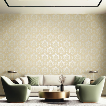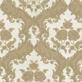Luxuriöse Vliestapete mit Vinyloberfläche, halbglänzender cremefarbener Hintergrund, braun-goldenes Barockmuster.