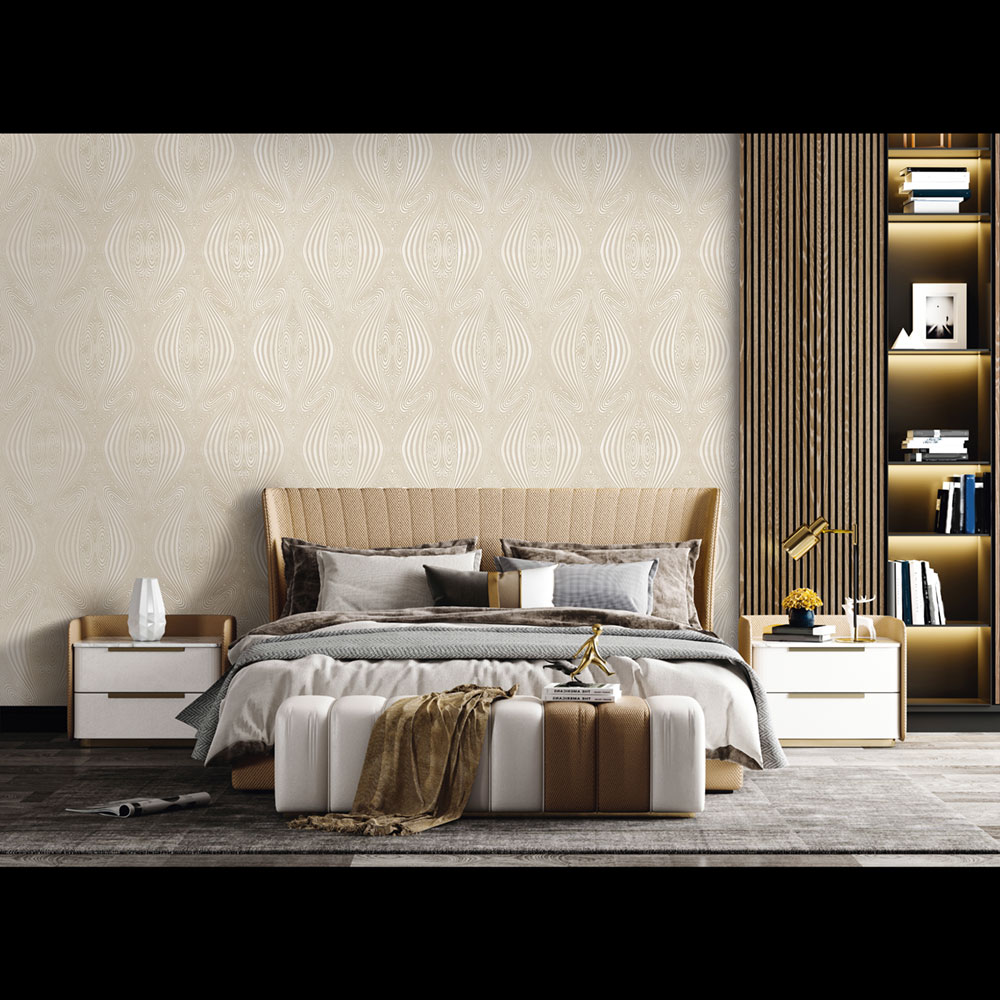 Luxuriöse perlweiße Vliestapete mit Vinyloberfläche. Je nach Lichteinfall verändern sich die Farbtöne.