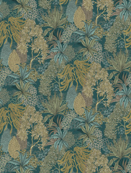 Vliestapete, Pflanzen- und Blättermotive in Grün- und Ockertönen.