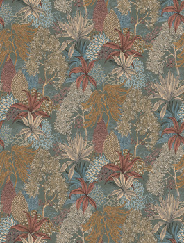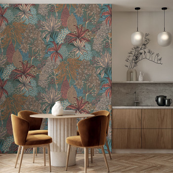 Vliestapete, Pflanzen- und Blättermotive in Blau- und Brauntönen.