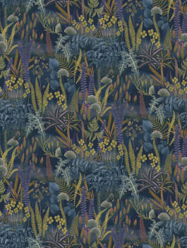 Vliestapete, Blumen- und Blättermotive in Blau-, Braun- und Ockertönen.