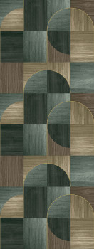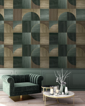 Geometrische Vliestapeten in Grün- und Brauntönen erinnern an hölzerne Wandverkleidungen.