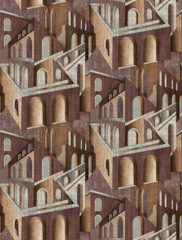Grafische Vliestapete, Burgunder- und Brauntöne, architektonisches Design.