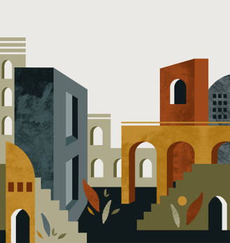Grafische Vliestapete, Braun-Rot-, Blau-, Ocker-, Grün- und Grau-Beige-Töne, architektonisches Design.