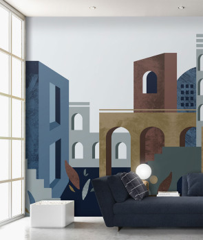 Grafische Vliestapete, Blau-, Braunrot-, Blau-, Braun- und Grautöne, architektonisches Design.