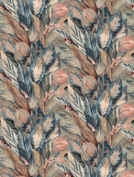 Vliestapete, Blätter in Blau-, Braun-, Rosa- und Grautönen.
