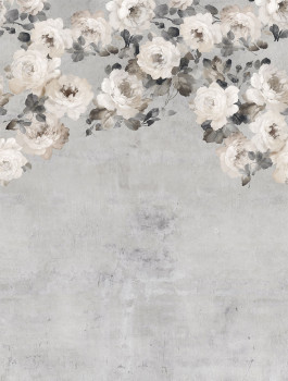 Vliestapete, florales Motiv, Grau- und Cremetöne.