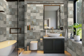 Strapazierfähige, abwaschbare, graue Vinyltapete. Originalgetreue Nachahmung von Fliesen.