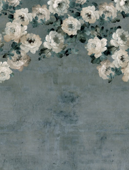 Vliestapete, florales Motiv, Grün-, Grünblau-, Grau- und Cremetöne.