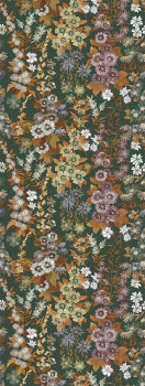 Vliestapete, florale Motive, Burgundertöne, Braun, Grau, grüner Hintergrund.