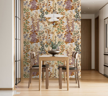 Vliestapete, florale Motive, Farbtöne von Burgunder, braun, grau, blau, grün, beige Hintergrund.