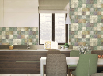 Strapazierfähige, abwaschbare, farbenfrohe Vinyltapete. Originalgetreue Nachahmung von Fliesen.