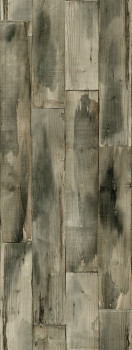 Vliestapete, Holzbrettimitat, Braun-Grün-Töne.