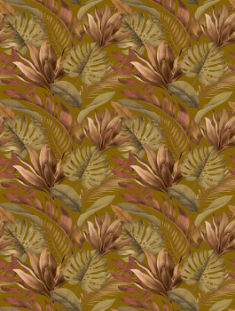 Vliestapete, tropische Blätter in Braun- und Grüntönen.