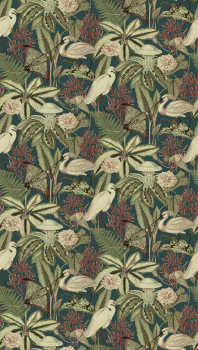 Vliestapete, tropische Blätter und Reiher, Grün-, Braun- und Beigetöne.
