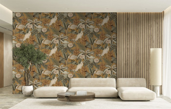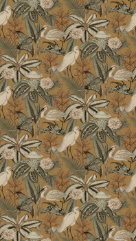 Vliestapete, tropische Blätter und Reiher, Senf-, Graugrün- und Beigetöne.