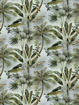 Vliestapete, Palmen und tropische Blätter, Grau- und Grüntöne.