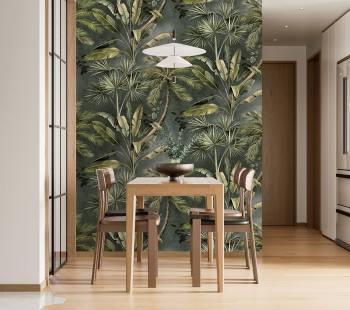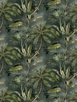 Vliestapete, Palmen und tropische Blätter, Grau- und Grüntöne.