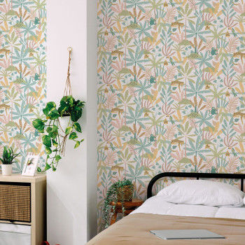 Vliestapete, Kindermotive von Dschungeltieren in Grün-, Braun- und Ockertönen, sehr feine Stoffstruktur.