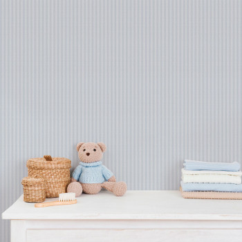 Vliestapete, blau-weiße Streifen, sehr feine Stoffstruktur.