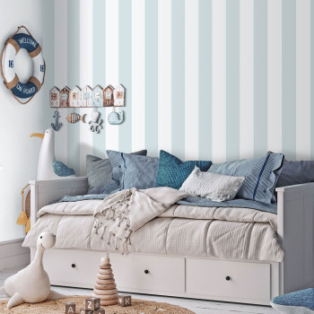 Vliestapete, blau-weiße Streifen, sehr feine Stoffstruktur.