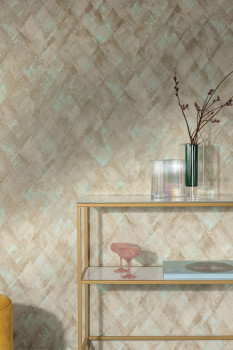 Vliestapete mit Vinyloberfläche, die Struktur ist ein Rautenmuster, Beige- und Graubeigetöne, feiner Halbglanz.