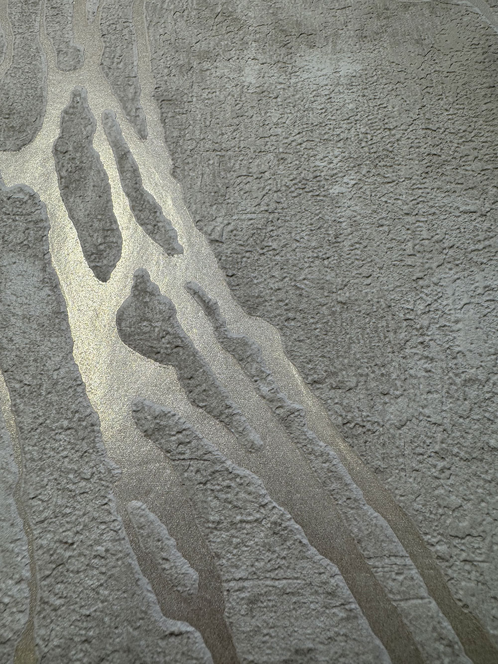 Vliestapete mit Vinyloberfläche, Stuck-/Betonimitation in Beigetönen, geprägte Metallic-Linien.