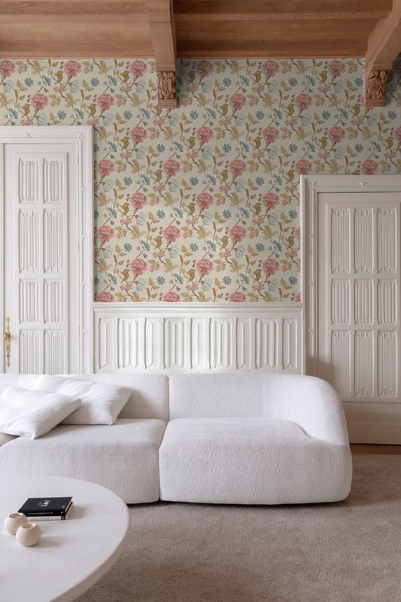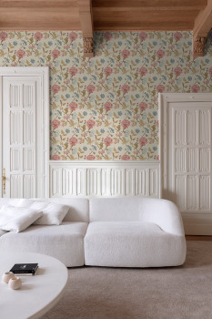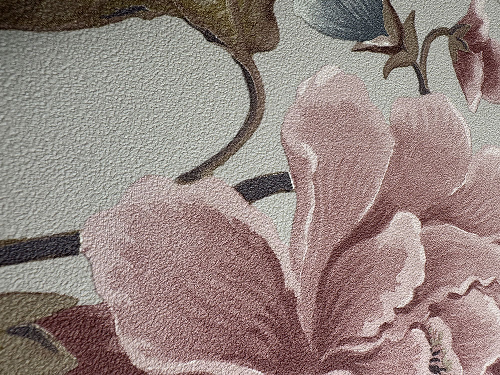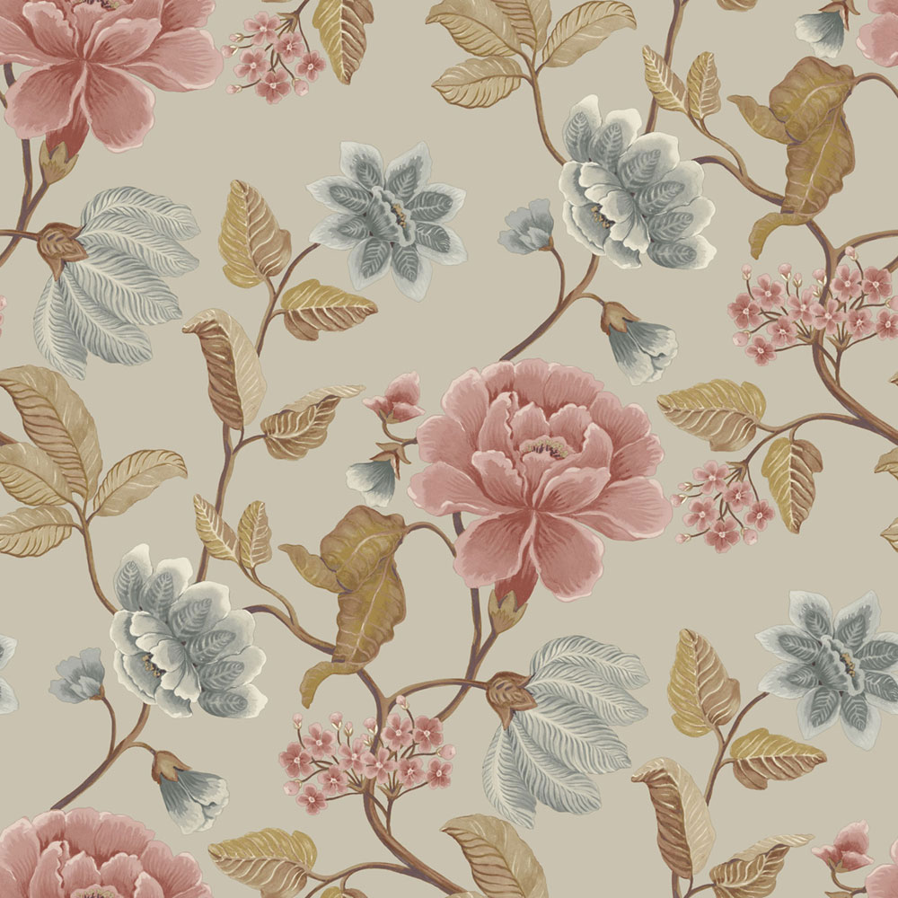 Vliestapete mit Vinyloberfläche, beigem Hintergrund, Blumen in Rosa-, Braun- und Graublautönen.
